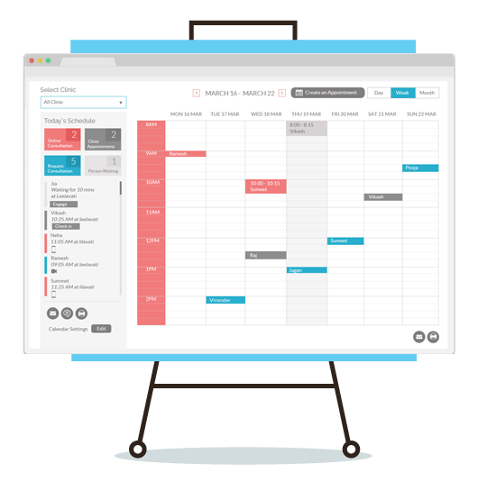 Manage all activities by selecting a time slot – add patient, view patient profile, connect for video calls, edit or cancel appointments and consultations and record visits.